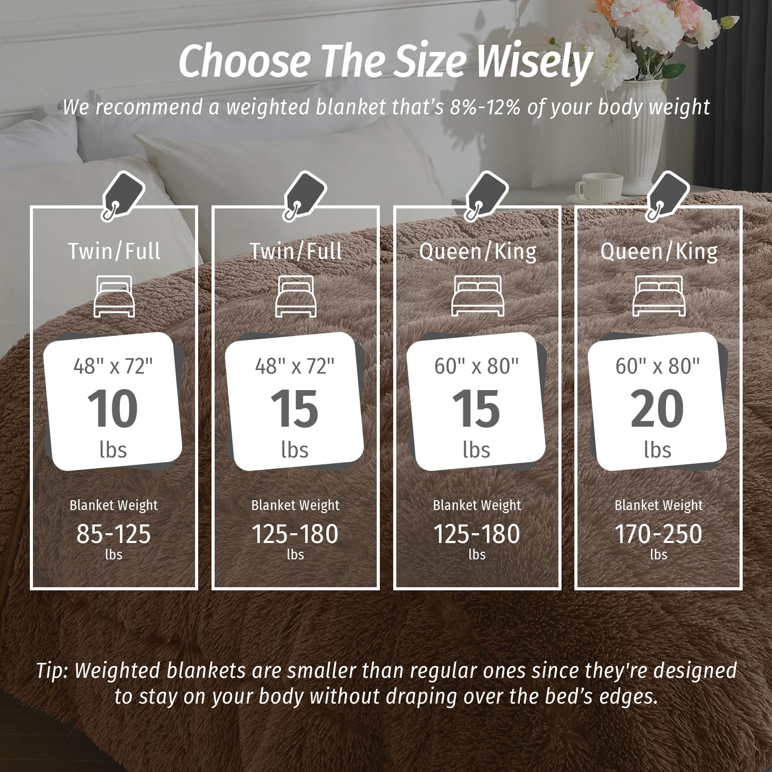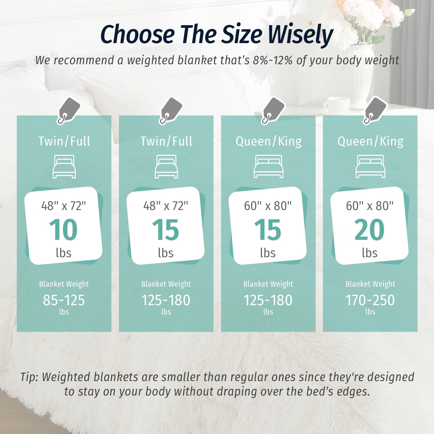 It is recommended to choose a weighted blanket weighing 8% to 12% of your body weight. But as per personal sensation variance, we suggest you to start off with a lighter weight and adjust the weight accordingly after 5 to 7 days use. If you are used to the weight, find our suggested weight as below:Twin/Full size:48" x 72" - 15lbs for individual weighing 120-190 lbs